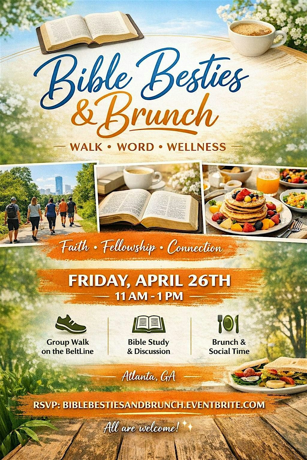 Looking for a chill way to connect with friends and dive into some inspiring reads? Bibles Besties and Brunch is the perfect in-person hangout! Enjoy great convo, tasty bites, and meaningful moments as we explore the Bible together. Whether you're a longtime friend or new to the crew, everyone's welcome!