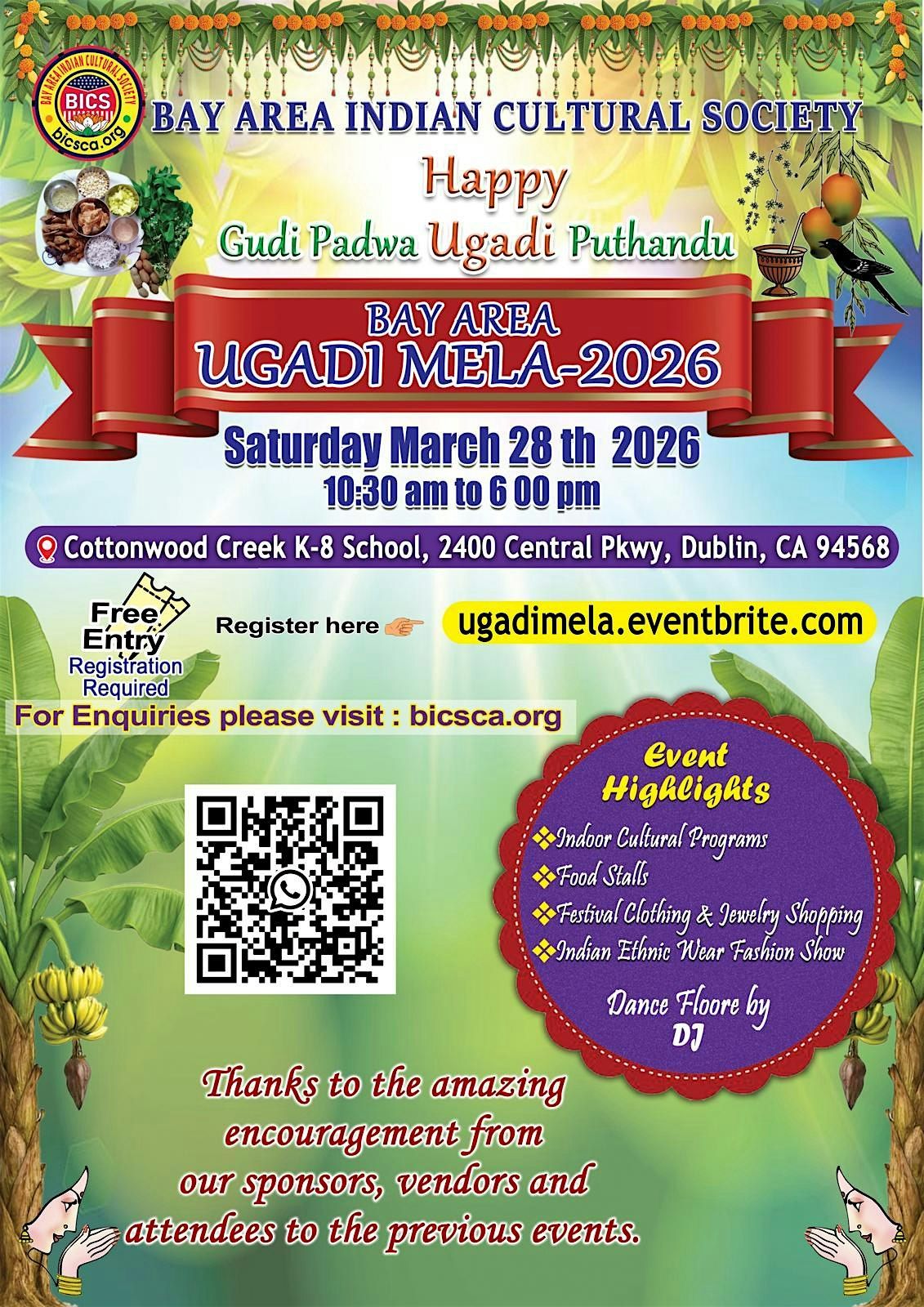 Note: Ugadi Mela-2026 is a free event brought to you by our nonprofit team. While we do our best to create a fun and safe experience, Bay Area Indian Cultural Society can’t be held responsible for any unexpected mishaps. Thanks for your cooperation—let’s enjoy the celebration together!