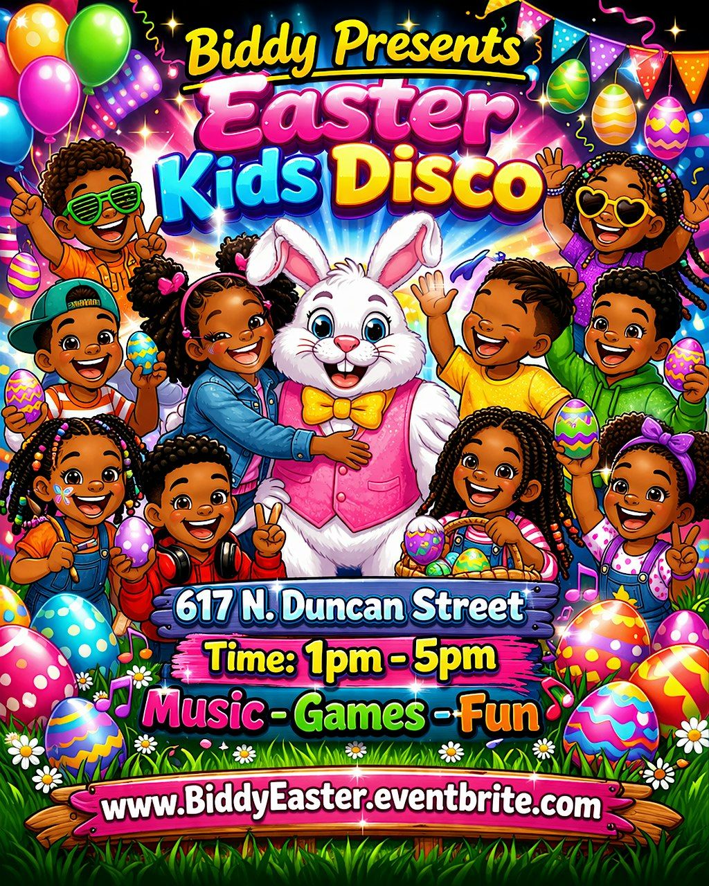Get ready for a fun-filled afternoon at 617 N Duncan St! Join us on April 5, 2026 at 1:00 PM (Eastern Time) for a super cool Easter disco just for the kids. There will be great tunes, dancing, and plenty of Easter vibes to keep the little ones entertained. Don't miss out on this awesome chance to celebrate and have a blast with friends!