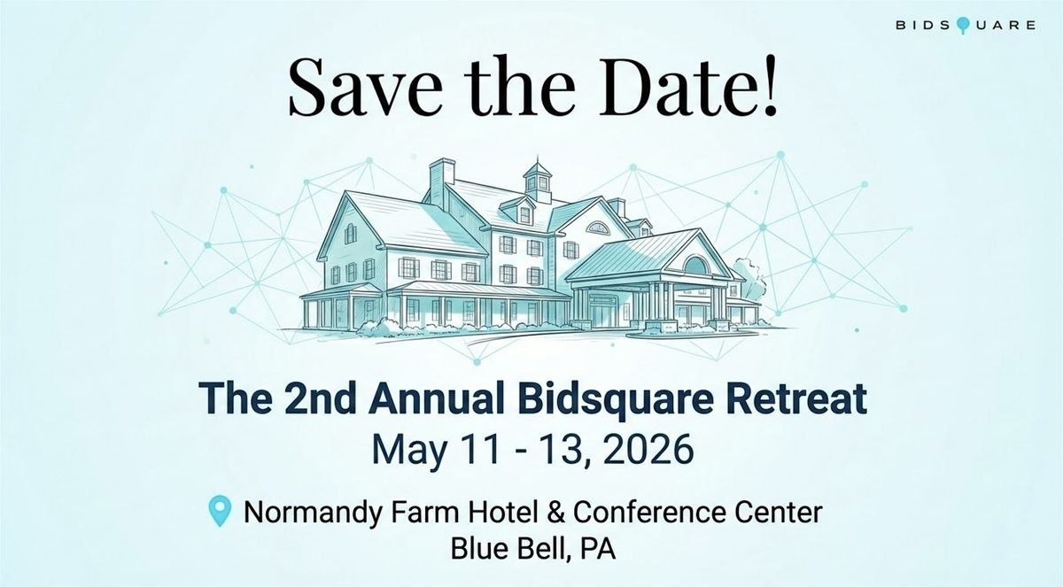 We are delighted to invite you to the 2nd Annual Bidsquare Retreat, returning this spring from May 11–13, 2026, at the historic Normandy Farm Hotel & Conference Center in Blue Bell, Pennsylvania. The retreat offers the rare opportunity to connect, set shared goals, and step into the next phase of what we are building together.