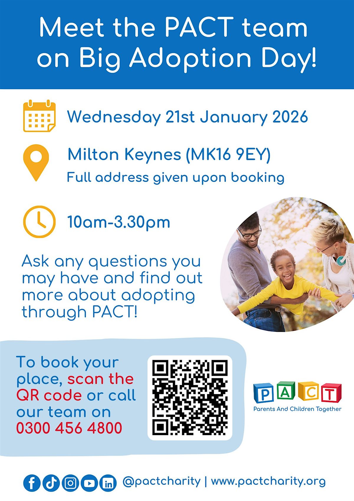 This Big Adoption Day, come along and meet the team in Milton Keynes (MK16 9EY). Ask any questions you may have and find out more about adopting through PACT.