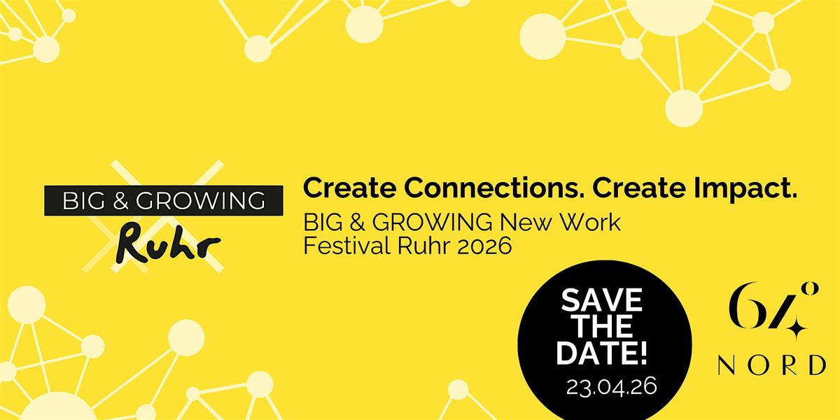 Denn die Arbeitswelt verändert sich nicht durch Schlagworte, sondern durch echte Verbindungen - zwischen Menschen, zwischen Organisationen, zwischen Ideen. Beim BIG & GROWING New Work Festival Ruhr 2026 schaffen wir Räume, in denen genau diese Verbindungen entstehen können und aus Austausch konkrete Wirkung wird.