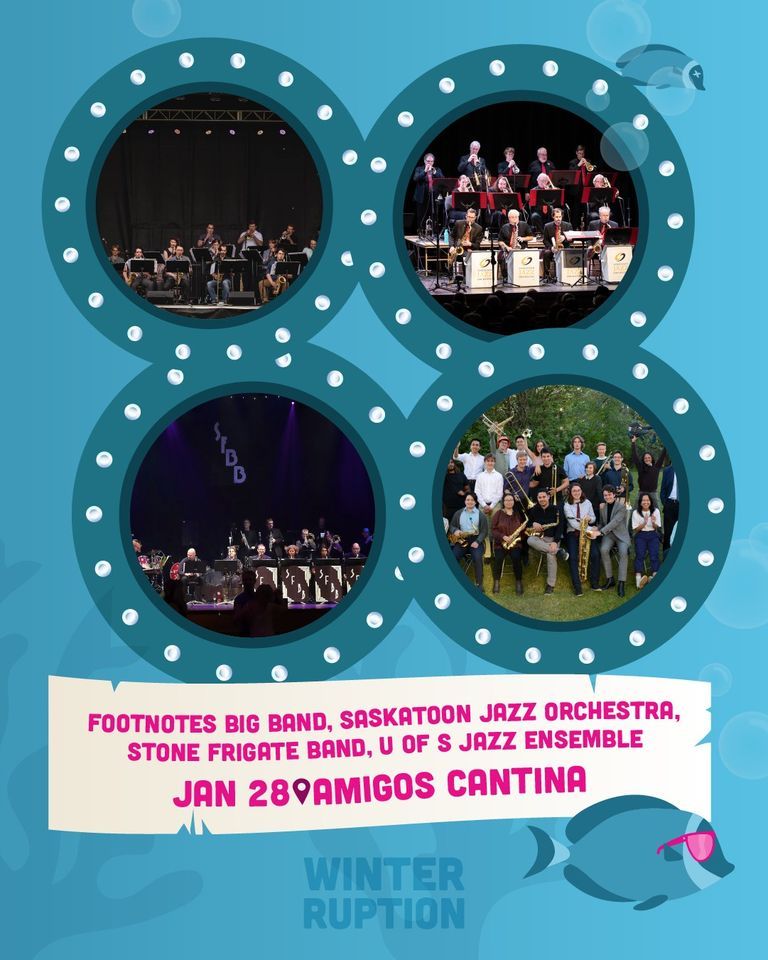 Big Band Theory: Latin Nights / Winterruption '23 / January 28th, 7:30PM / Broadway Theatre, SaskatoonWe have a working theory…That many humans in the dead of winter would enjoy 1 night to hear 4 big bands playing jazz! Join us for the first-ever meeting of the bands featuring the UofS Jazz Ensemble, Stone Frigate Big Band, Footnotes Big Band and Saskatoon Jazz Orchestra. 2 fun filled sets of music with 2 bands per set, January 28, 2023! We’ve subtitled this concert 'Latin Nights’ to provide a bit of theme for the event. Come enjoy music from Saskatoon created especially for Winterruption 2023!