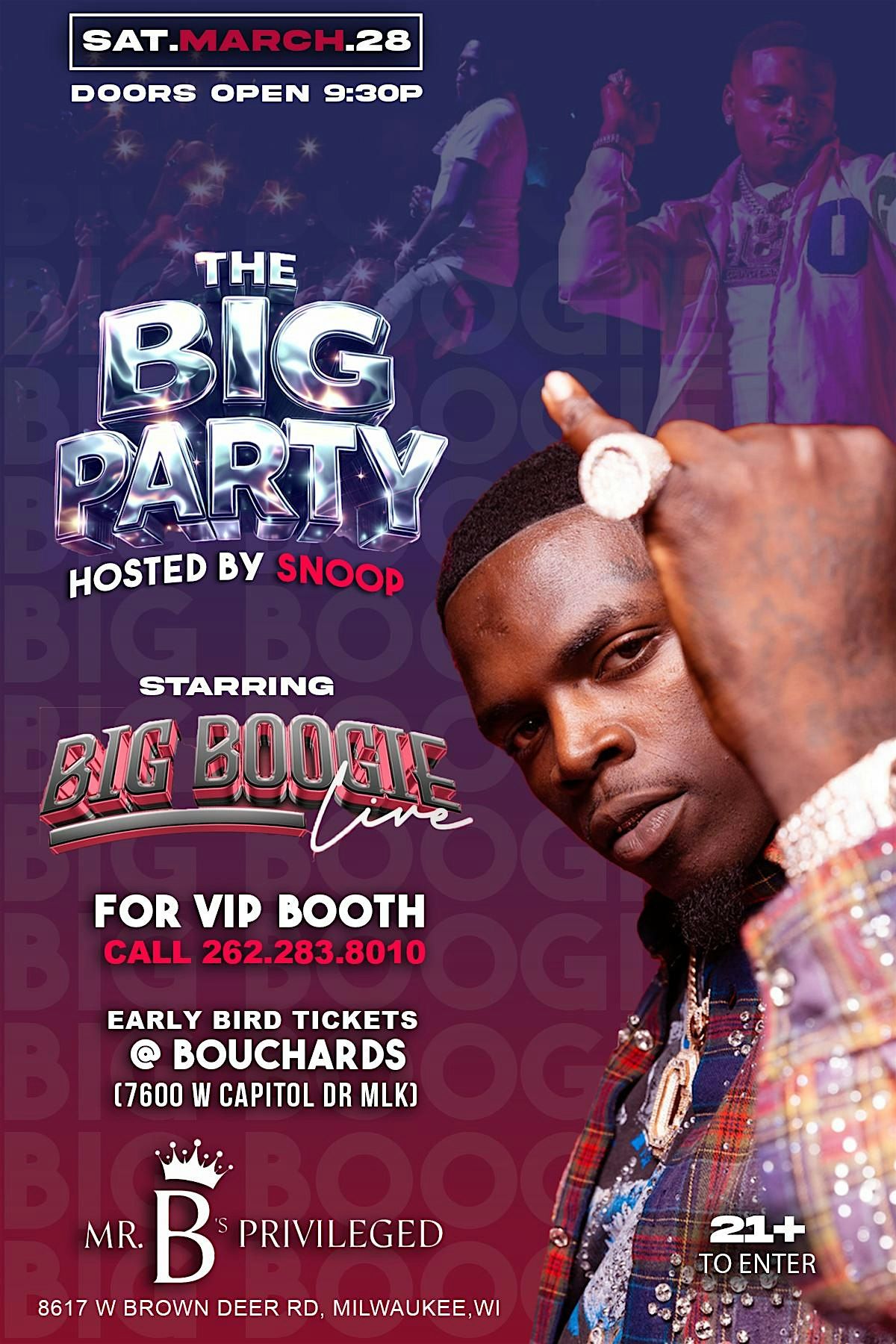 The Big Party hits Mr. B’s Privileged Lounge on Saturday, March 28th featuring Big Boogie live — hosted by Snoop.