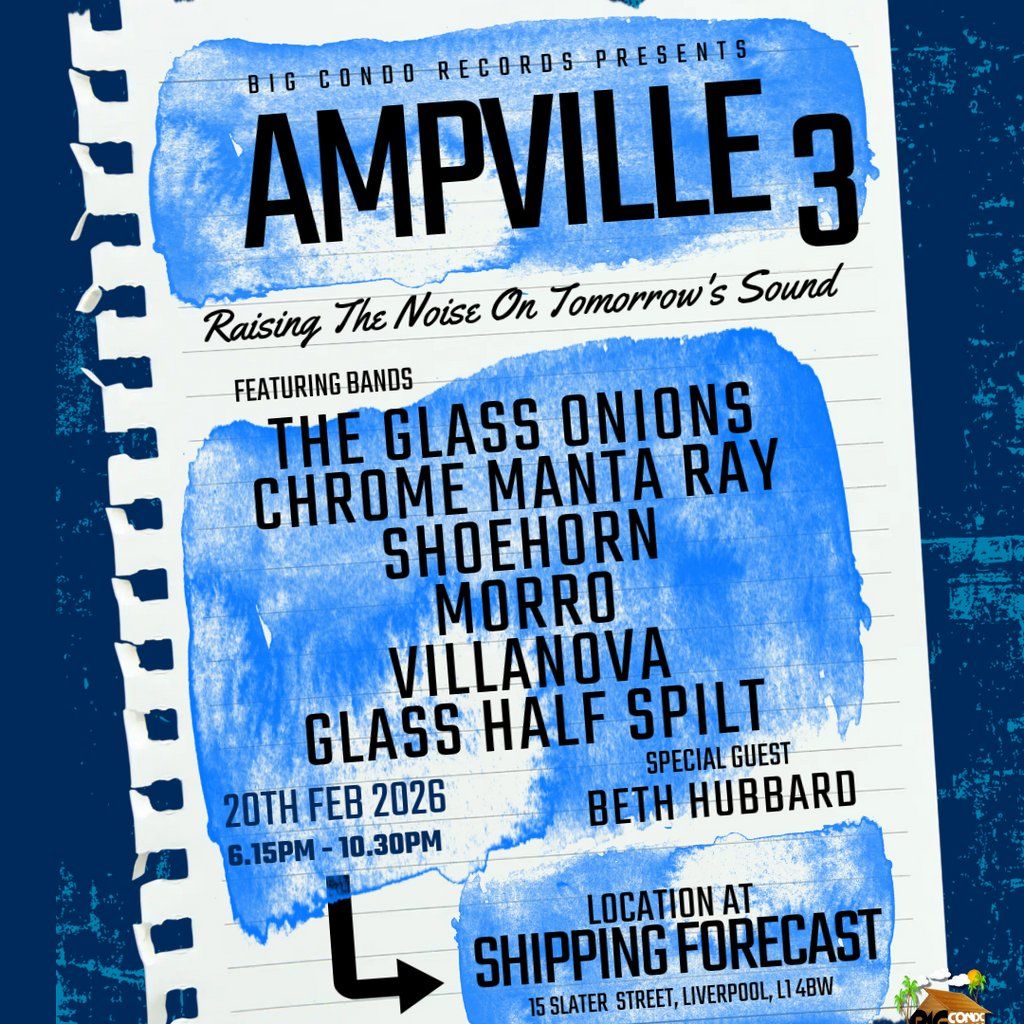 Big Condo Records Presents Ampville 3 with The Glass Onions, Villanova, Morro, Shoehorn, Chrome Manta Ray, Glass Half Spilt and Beth HubbardMusic Genres : Rock, Indie, Metal, Alternative