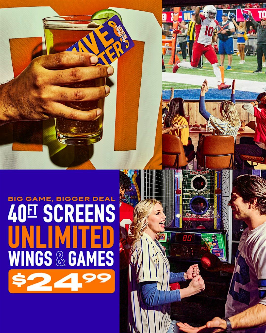 *PROMOTIONAL. Limited time only. Big Game Ticketed Experience. Offer valid 2/8/26 only. Starting at $24.99, receive premium seating access, All You Can Eat Wings until the final whistle of game, and unlimited game play all day. Tickets must be purchased in advance through FEVER up until 2:00 p.m. eastern/1 p.m. central/11am p.m. pacific on 2/8/26. All You Can Eat Wings valid one per person, per seating, on premise. Get traditional and boneless wings with Classic Buffalo, Honey BBQ, or No Sauce. First individual order includes 8 traditional or boneless wings and side of ranch. Reorders include 6 traditional or boneless wings. One choice of sauce per order. Cannot mix traditional and boneless in the same order. No take home bags. Participants eligible for various in select game live moments and surprise activations, to be determined by store. Offer not available for walk-in guests. Not to be combined with other offers. Available in store only. Dine in only. Excludes human crane, VR and redemption games. Promotion may be subject to revision or rescission at any time. Prices may vary by location. Tax and gratuity not included. Subject to availability. Valid at participating locations only. Store participation may vary. Not available with any other promotion. Not available in Honolulu/Ala Moana and select stores. Other restrictions may apply. Void where prohibited. See store for details.