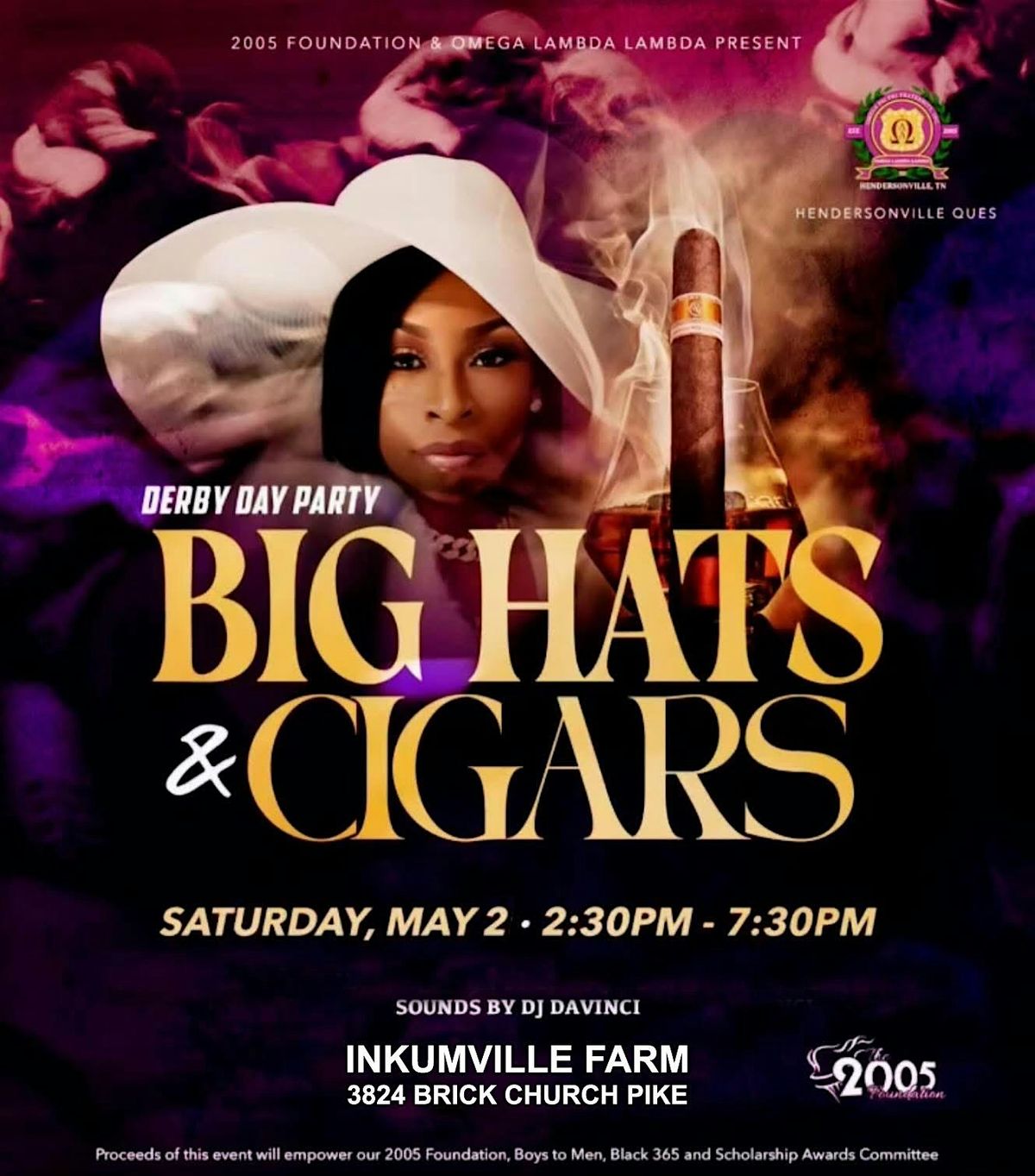 Experience the most coveted Derby Day event in Nashville, BIG HATS & Cigars, hosted by the men of Omega Psi Phi fraternity, Inc., Omega Lambda Lambda Chapter at Inkumville Farm in Bellshire. Nestled in the heart of nature, with rolling hills and ponds, the farm offers a stunning view of the Nashville skyline. The event promises an exceptional evening with premium cigars from Black Dog Cigar, exquisite dining by Bacon and Caviar, and our famous Mint Juleps crafted with Uncle Nearest's fine bourbon. DJ Davinci will maestro the mood. We look forward to seeing May 2nd.