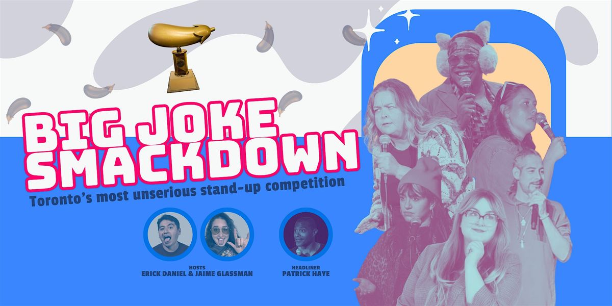 Come join us this January for the 3rd edition of Big Joke Smackdown 🥊, Toronto’s most unserious stand-up competition. We're once again inviting some of our favorite rising comedians to our stage, to see if they can win over the crowd and earn our highly coveted, one-of-a-kind, Golden Eggplant Trophy™ ✨🍆 !!