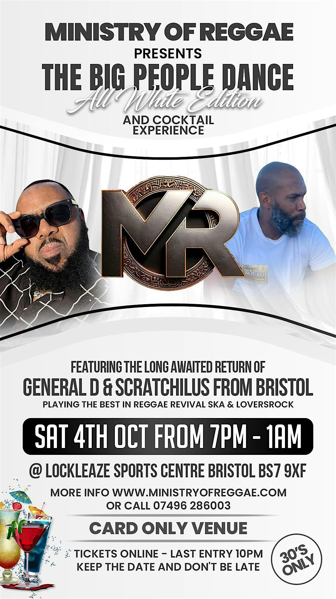 Ministry of Reggae Presents "BIG PEOPLE DANCE", First Saturday of Every Month. Featuring The All White Edition & Cocktail Experience, with Djs General D & Scratchilus. Purley for individuals who loves good quality reggae music with a positive energy. Come and reminisce with like minded people in a great atmosphere. Listening to the very best of lovers-rock, reggae revival & ska. Happy Hour 8pm - 9pm. Arrive before 10pm and get entered into free champagne raffle. Free Parking, Full air conditioning,