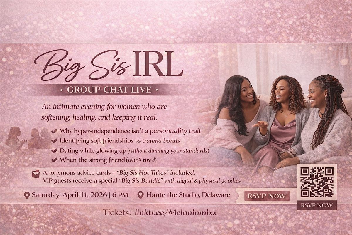Get ready to hang out with your favorite crew in person! Big Sis IRL: Group Chat Live is all about bringing that group chat energy offline. Come join the fun, share stories, and vibe with everyone face-to-face. No screens, just good times and even better company. Don’t miss out on the ultimate IRL hangout!