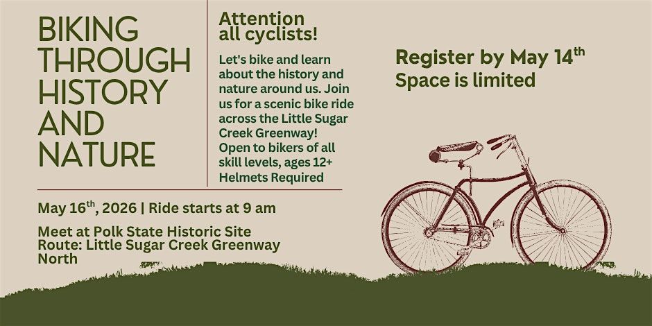 Join us for a fun ride at the President James K. Polk State Historic Site on May 16, 2026 at 9:00 AM. Explore the Little Sugar Creek Greenway while soaking in some cool history and nature vibes. Whether you're a casual biker or a history buff, this event is a great way to enjoy the outdoors and learn something new. Don’t forget your bike and helmet!