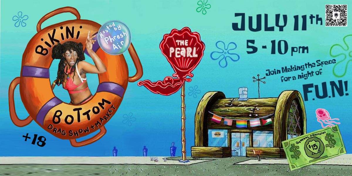 Dive into a night of fun July 11th, 5-10pm at The Pearl! There will be an art market, drag show, and campy spongebob vibes.