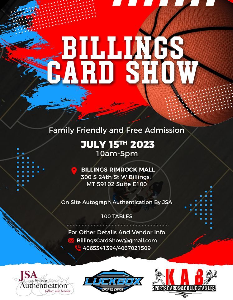 Billings Sports Card, memorabilia, and gaming show. Rimrock Mall 300 S 24TH ST BILLINGS, MT FREE ENTRY, FAMILY FRIENDLY