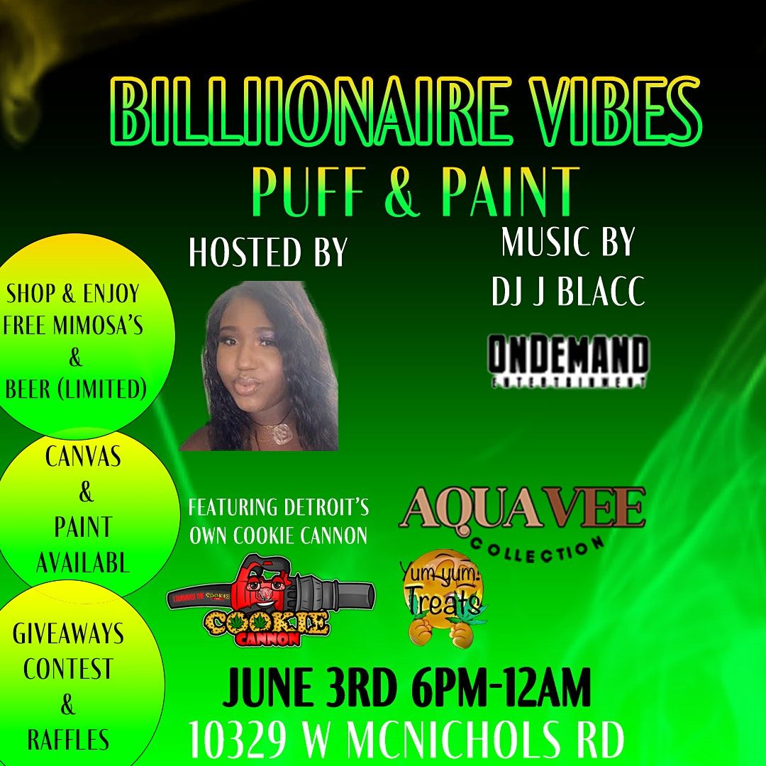 Billionaire Vibes Puff and Paint Event. Free General Admission! Tickets available for paint and puff portion. This is a pop up shop event come shop and network with some of the hottest entrepreneurs in the city. Call 313 938 9924 if you would like more information on being a vendor at this event.