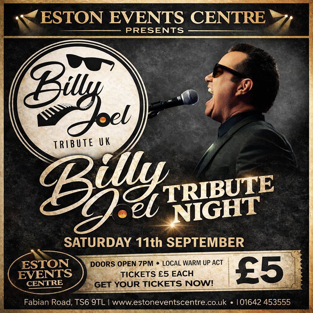 Billy Joel Tribute Night at Eston Events Centre! Live hits, local warm-up act, doors 7pm. Tickets £5. Don't miss it!Music Genres : Pop, Jazz