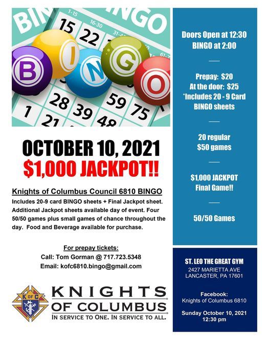 Bingo is back at St. Leo's! Join us as we support the charitable work of the Knights of Columbus and have a fun time to possibly win some money!Doors open at 12:30pm and Bingo itself starts at 2pm. Bingo takes place in the gymnasium of the school. There will be a few optional 50/50 bingos and a $1000 jackpot bingo game at the end.