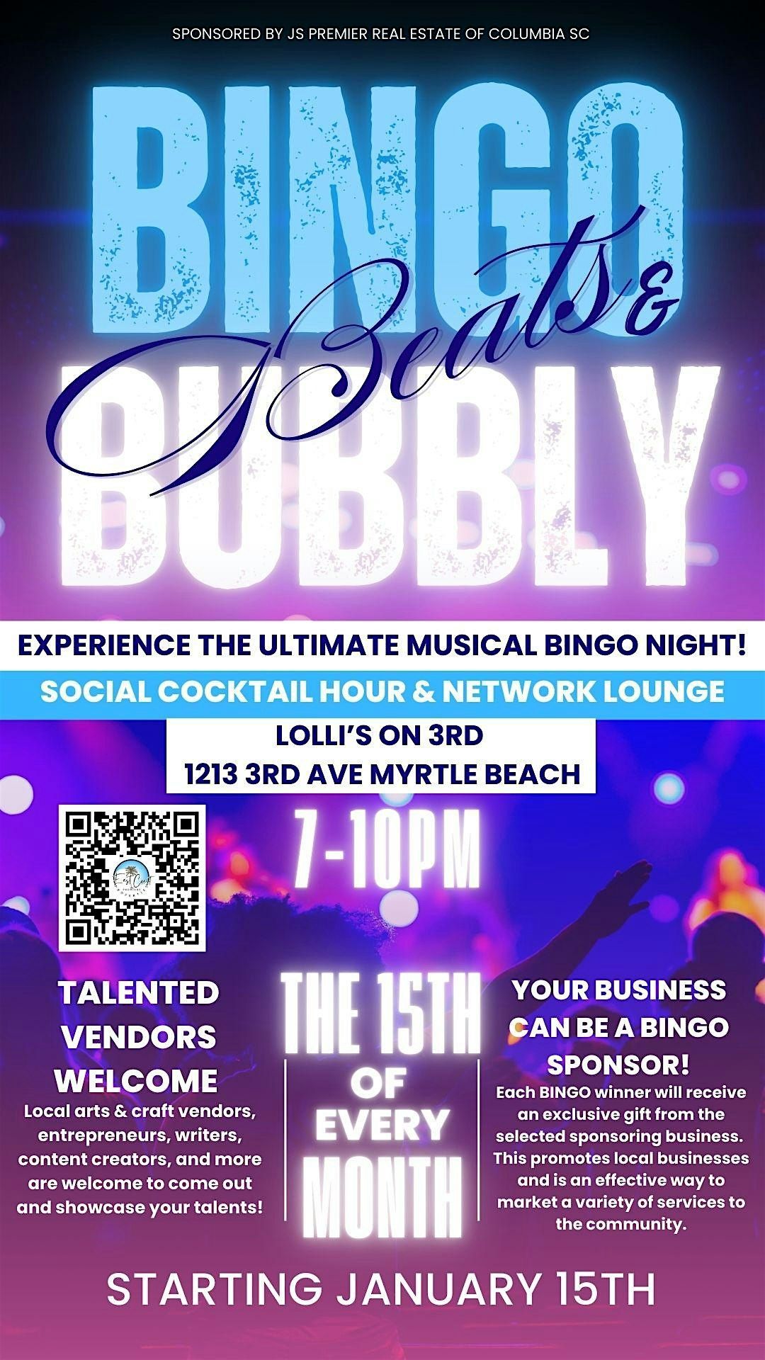 Get ready for an unforgettable evening of fun, connection, and community at Bingo, Beats, & Bubbly! Held on the 15th of every month at Lolli's on 3rd, starting January 15th, 2025, this lively event combines the thrill of musical bingo with the perfect dose of networking and entertainment. Musical Bingo: Groove to the beats of your all-time favorite songs while marking your bingo cards. Each round offers a chance to win fantastic prizes sponsored by a featured local business or entrepreneur. Cocktails & Networking: Kick off the night with a cocktail and mingle with like-minded individuals, entrepreneurs, and community members in a relaxed and vibrant atmosphere. Refreshments & Entertainment: Enjoy delectable bites and captivating entertainment as you soak up the evening vibes. Spotlight on Local Talent: Each event highlights a local business or entrepreneur, showcasing their talent and contributions to the community. Game winners take home special gifts from the featured sponsor, offering a delightful way to discover and support local gems. Whether you’re here to play, network, or simply have fun, Bingo, Beats, & Bubbly is the place to be. Don’t miss this monthly celebration of community, connection, and creativity!