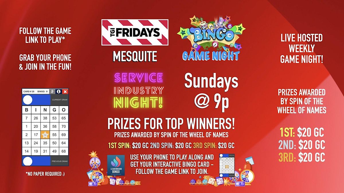 TGI Fridays - Mesquite, TX hosts the BINGO Game Night every Sunday at 9p - Join us for great food, drinks and fun on Service Industry Night!