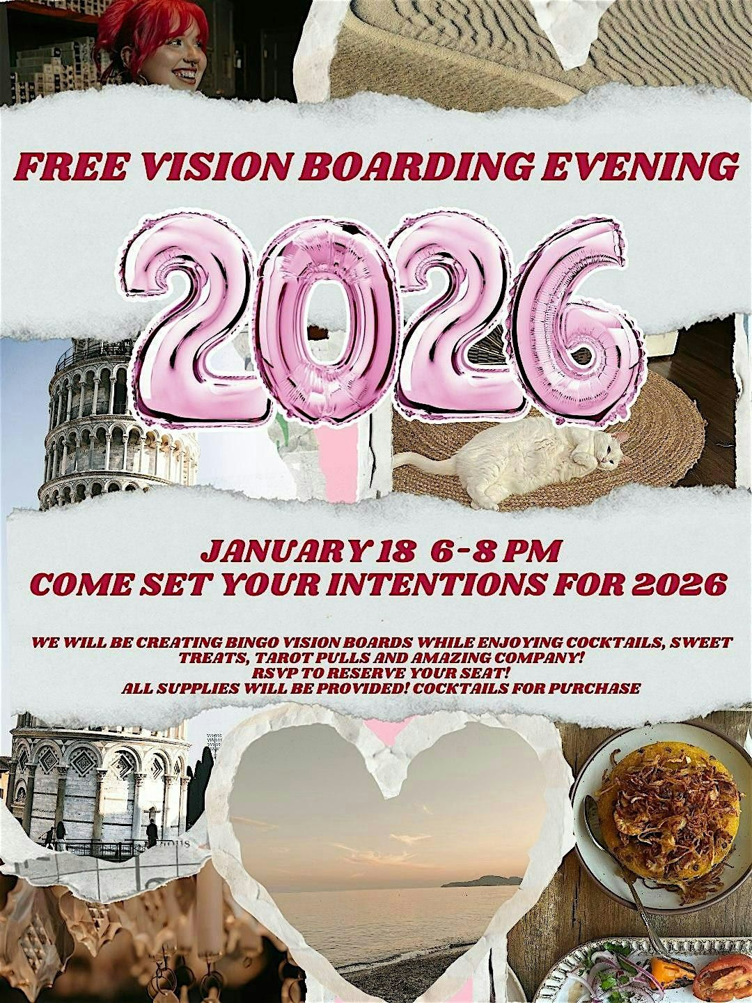 Sip on cocktails, enjoy sweet treats, and receive a tarot card pull to help guide your 2026 vision. All supplies are provided, just bring your goals and an open mind.