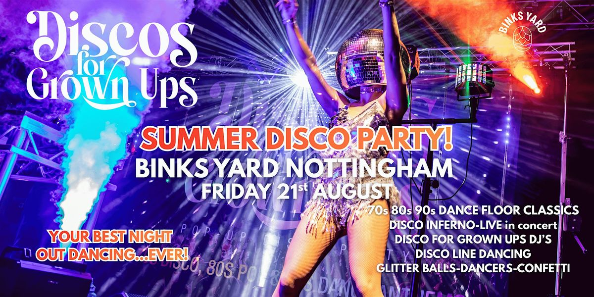 The Discos for Grown ups 70s 80s 90s DISCO PARTY is coming to the amazing Binks Yard Nottingham Friday 21st August for an incredible boogie night to remember!