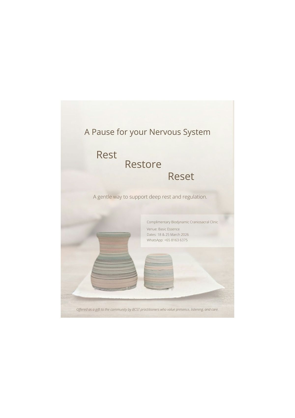 Join us in person for a complimentary relaxing and healing session at the Biodynamic Craniosacral Clinic. Discover gentle touch techniques that support your body's natural ability to heal and balance. Whether you're curious or looking for relief, this is a great opportunity to experience deep relaxation and holistic care. Come as you are and feel the difference!