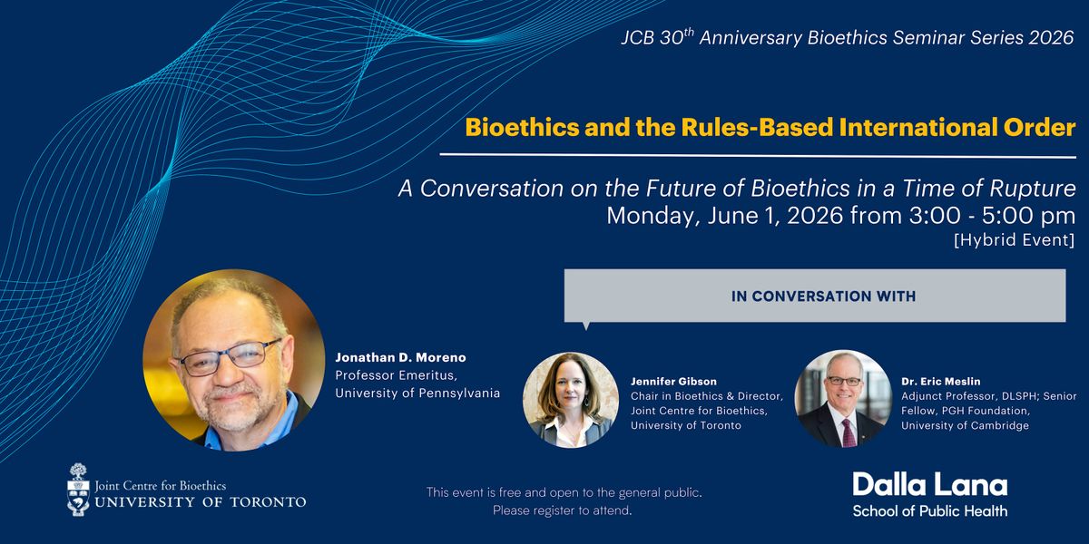 Join us for a special JCB 30th Anniversary Seminar Series event with Jonathan Moreno (University of Pennsylvania) in conversation with our very own JCB Director, Jennifer Gibson, and moderated by Eric Meslin (University of Toronto and University of Cambridge).