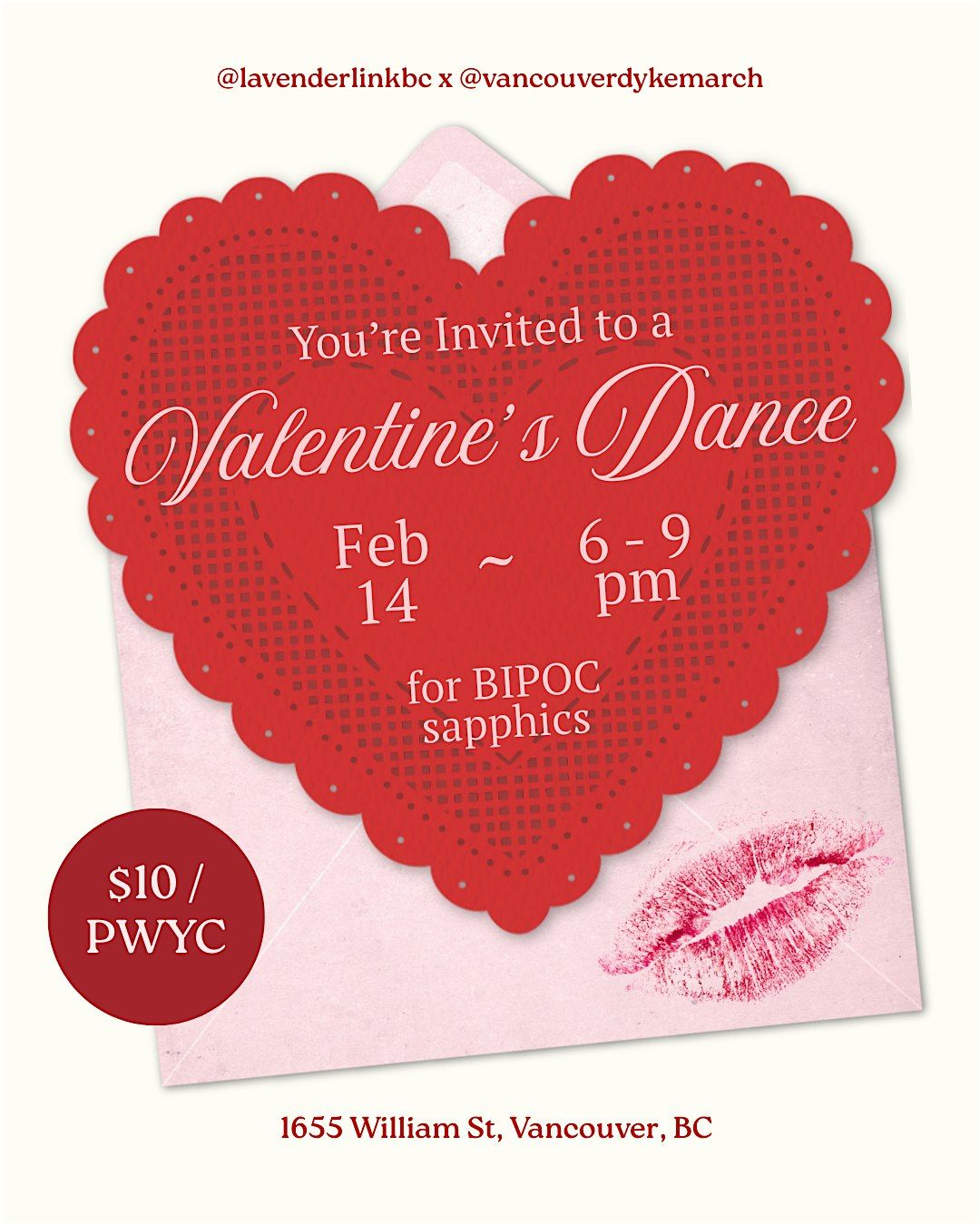 We are partnering up with our friends at the Vancouver Dyke March to put on our first major event of the year, a Valentine's Day Dance for QTBIPOC identifying sapphics! With fantastic DJs, handmade decorations, and delicious desserts (while quantities last), be prepared to dance the night away. Bring your friends, loved ones, and most importantly, yourself, as we celebrate love and community. Fancy/campy outfits are optional but encouraged!
