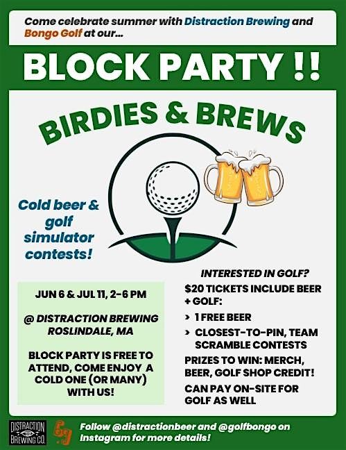 Join us for good vibes, cold beer, and fun golf on Distraction Brewing's outdoor patio, July 11th 2-6pm! Ticket includes one (1) free drink ticket AND entry into Closest-to-Pin and Team Scramble golf contests (details below). Don't miss Roslindale's best kickoff to summer! Rain date: July 12th, 2-6pm.