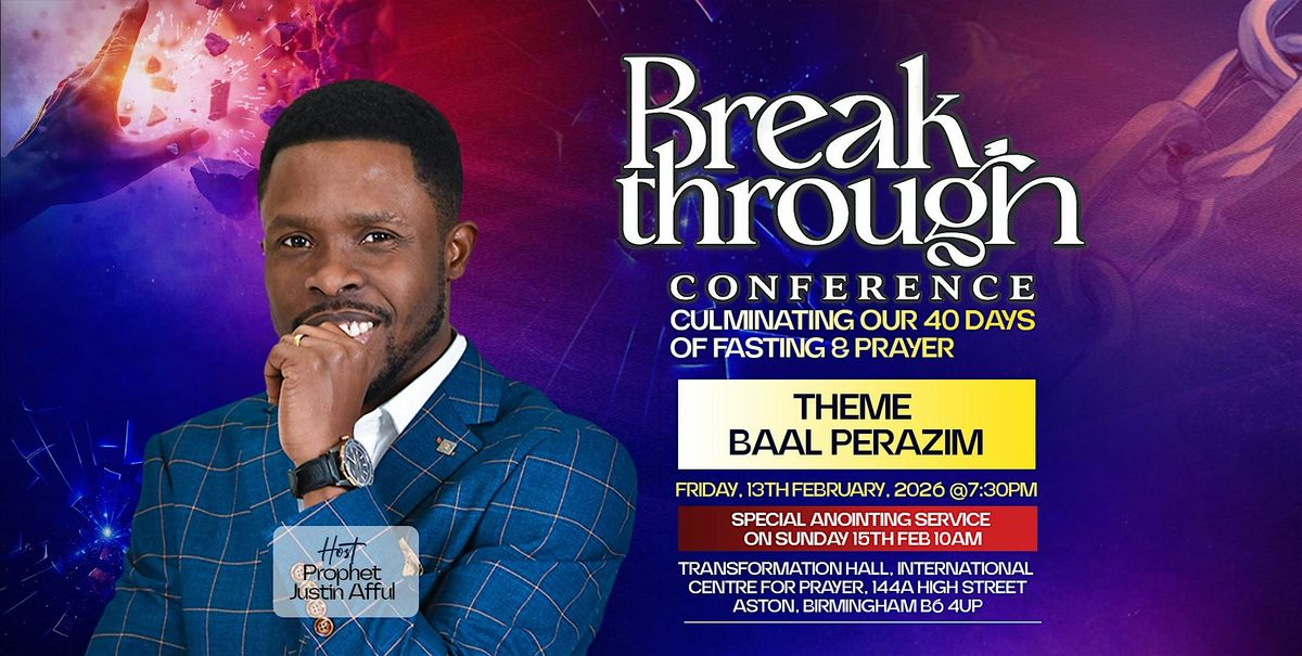 The Breakthrough Conference is a Spirit-led encounter centred on the theme Baal Perazim “The Lord who breaks through.” Just as God went before David and caused a decisive breakthrough, we believe He will move mightily again, breaking barriers, releasing victories, and opening long-awaited doors.