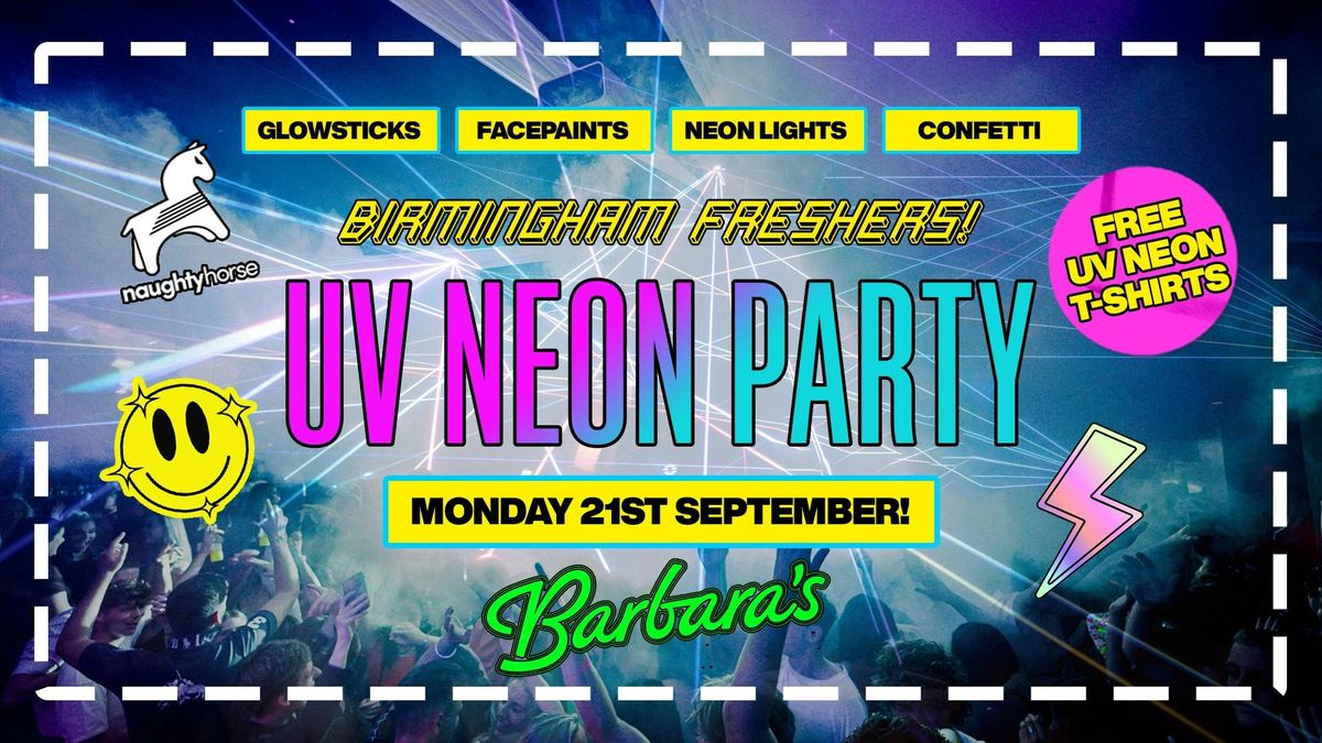 🚨FRESHERS UV PARTY - Birmingham Freshers 2026! 🚨The Naughty Horse Freshers UV NEON PARTY is always one of the most talked about nights of freshers week! This year we take over the legendary BARBARA's on Broad Street and transform the venue into the ultimate neon playground! Expect: