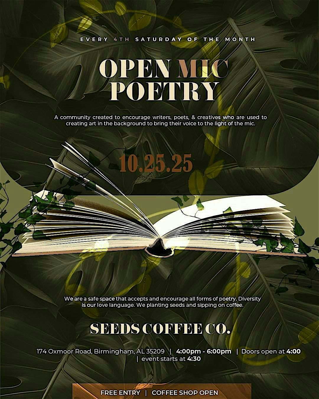 We are hosting open mic poetry every 4th Saturday of the month at Seeds Coffee.
