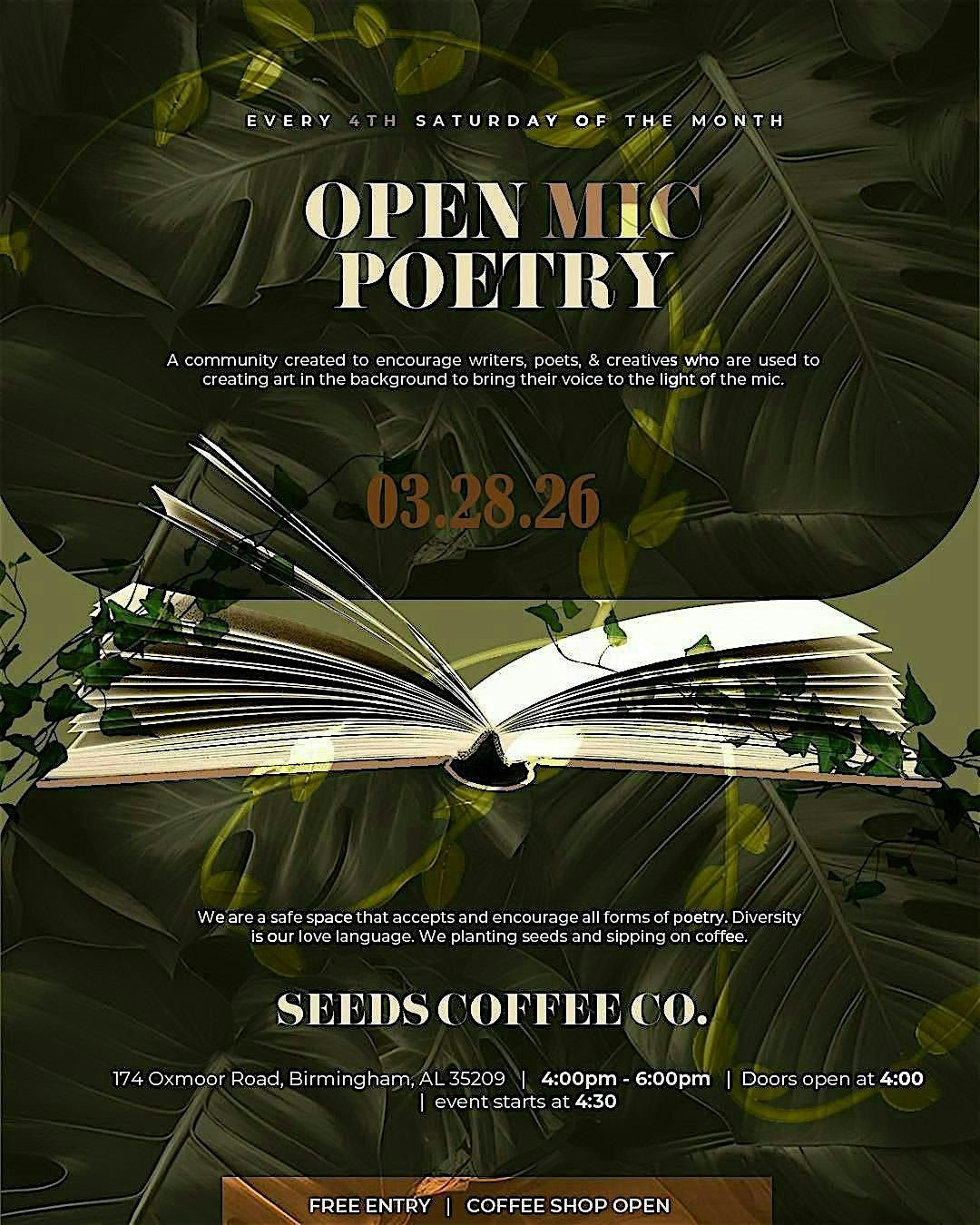 We are hosting open mic poetry every 4th Saturday of the month at Seeds Coffee.