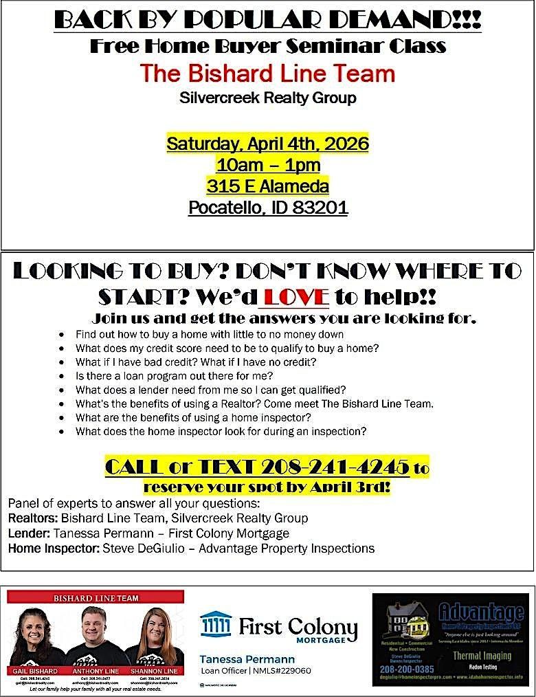 LOOKING TO BUY? DON’T KNOW WHERE TO START? We’d LOVE to help!! APRIL 4TH. 10AM-1PM AT 315 E ALAMEDA ,POCATELLO. RSVP 208-241-4245. FREE