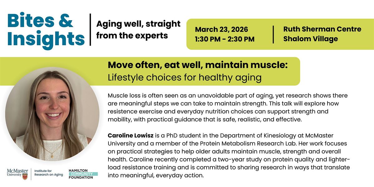 Join researchers and experts from the McMaster Institute for Research on Aging (MIRA) for Bites & Insights, a community talk series designed to share practical, evidence-based ways to stay healthy and engaged in the activities you enjoy as you age. Each session includes time for audience questions and open discussion. Light refreshments will be provided.