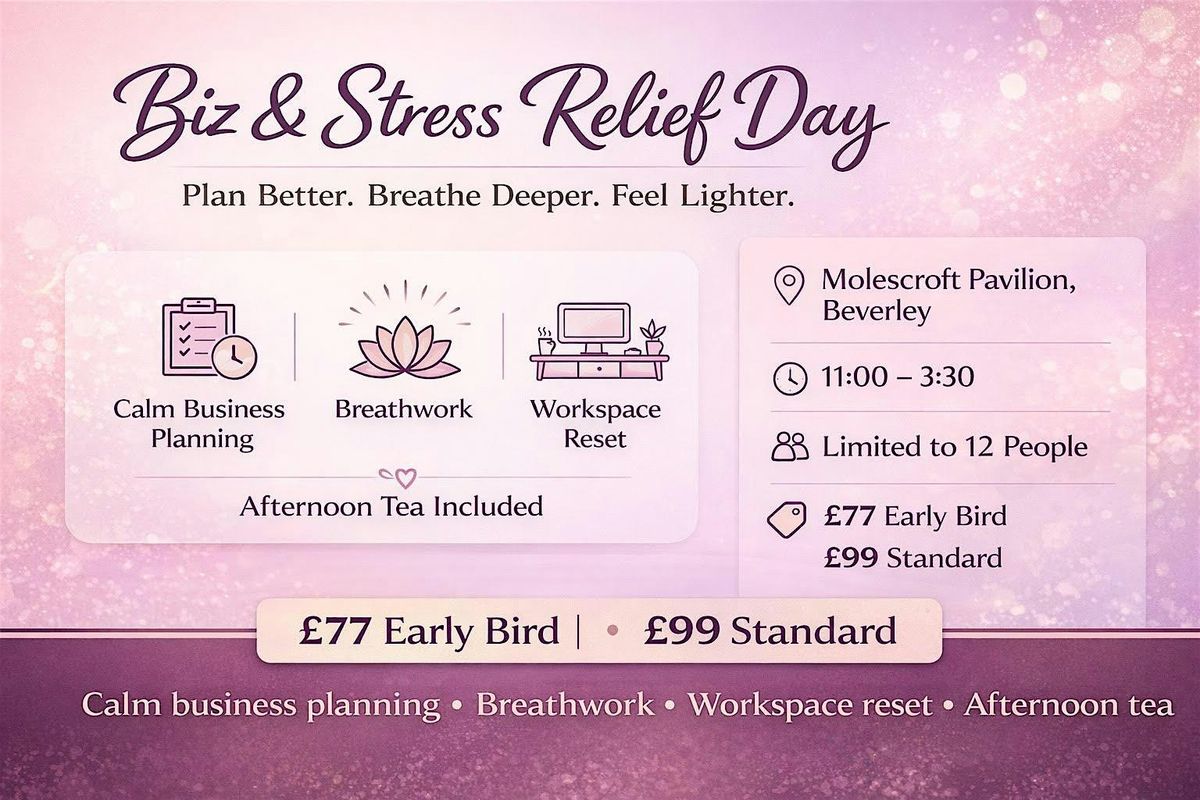 Biz & Stress Relief Day is a calm, practical workshop designed to help business owners and side hustlers to reduce stress, gain clarity, and create routines that feel supportive - not exhasuting.
