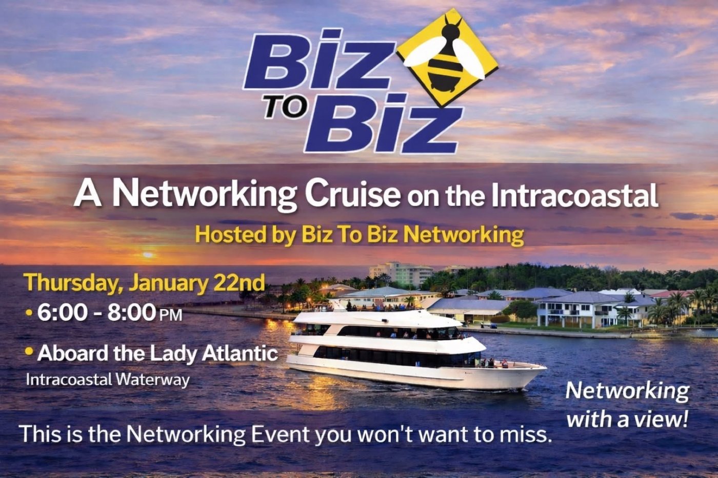 Biz to Biz Networking Invites You To Join us at this one of a kind Networking Event on the Beautiful Lady Atlantic Cruise! …a perfect opportunity to make some new connections while cruising down the Intracoastal!
