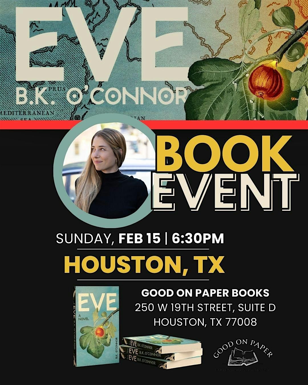 Come meet Houstonian B.K. O'Connor as she discusses Eve, her debut novel! Eve is "a bold reimagining of Eve’s journey after Eden, set in ancient Mesopotamia and beyond, for readers who crave feminist myth retellings and spiritual exploration." Becky will give an author talk before opening the floor to any questions, and of course, she will be sure to sign your copy of Eve before you head out!
