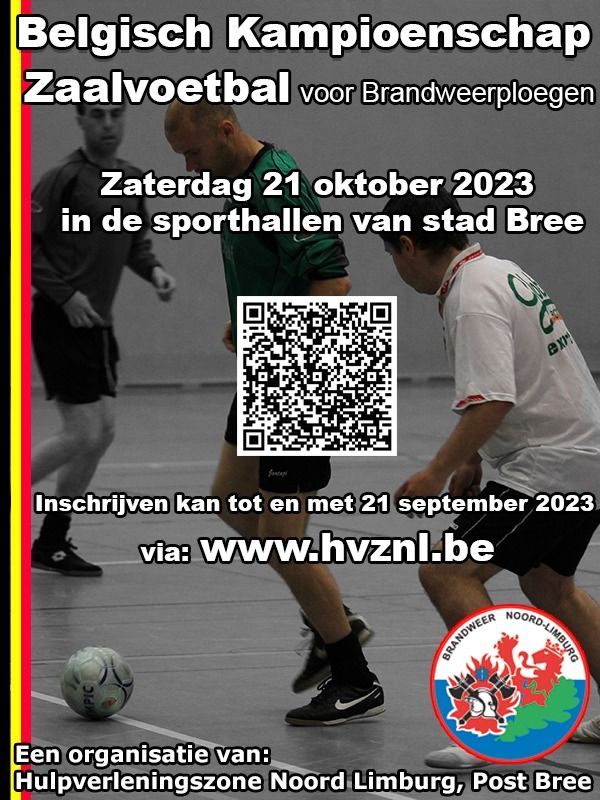 De brandweermannen van post Bree nodigen je uit je voetbalschoenen aan te trekken! Op zaterdag 21 oktober 2023 organiseert Hulpverleningszone Noord-Limburg- post Bree het Belgisch Kampioenschap zaalvoetbal voor brandweerploegen.