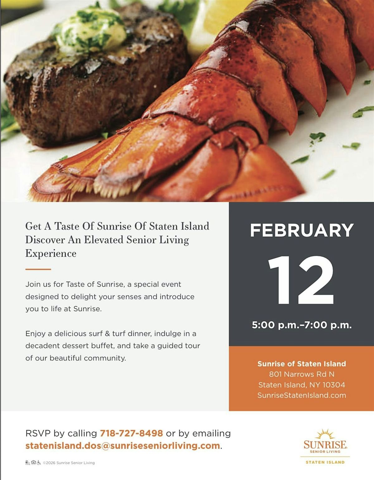 Join us for a surf and turf dinner at Sunrise Senior Living of Staten Island!
