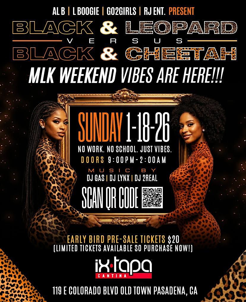Get ready to unleash your wild side this MLK weekend! Join us for an unforgettable night of vibes, music, and fierce fun as Black & Leopard take on Black & Cheetah. No work, no school—just pure celebration! Doors open at 9 PM, and the party goes until 2 AM. Early bird tickets are limited, so grab yours now and let’s make memories together!