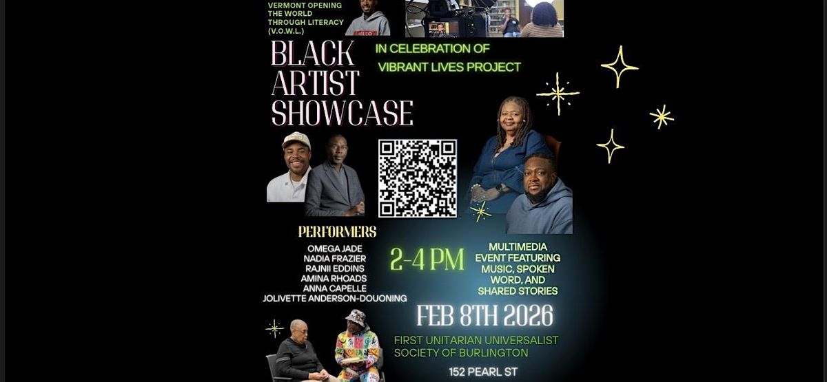 Black Artist Showcase in Celebration of Vibrant Lives Project featuring Vermont Opening the World Through Literacy (V.O.W.L.)This dynamic event lifts up Vermont’s Black creatives, community storytellers, and culture keepers through an evening of performance, interactive literacy experiences, and intergenerational sharing. Together, the Black Artist Showcase, the Vibrant Lives Project: Discovering Our Roots of Black Vermont, and V.O.W.L. create a powerful space where art, ancestry, and imagination come alive—inviting the whole community to explore heritage, honor Black brilliance, and celebrate the joy of learning and self-expression.