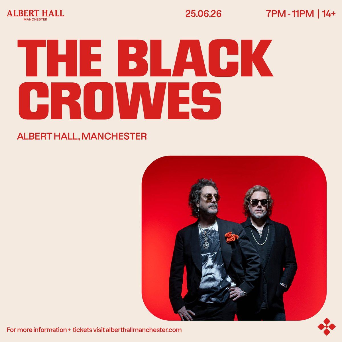Black Crowes at Albert Hall Manchesterš Be part of history at Black Crowes Manchester Tickets, an extraordinary gathering that will captivate your imagination! šļø The prestigious Albert Hall Manchester in Manchester, EN sets the stage for an unforgettable experience on June 25th, 2026 at 07:00 PM. ⨠They are bringing together the finest elements of entertainment and innovation to create moments that will take your breath away. From the moment you arrive, you'll be immersed in an atmosphere of wonder and excitement. šÆ This carefully planned event ensures every guest experiences something truly special. š« Get your tickets at 456.99 EUR. š Early booking is recommended for this must-attend event of the season!