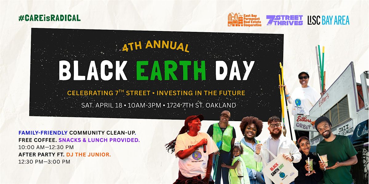 On Saturday April 18, join us, EB PREC and LISC Bay Area for live DJs, art, food and so much more at our community cleanup - BLACK EARTH DAY. Come celebrate black arts, black organizations and businesses, and black neighborhoods by giving some care to 7th Street. Bring the whole family! We will meet in front of the historic Esther’s Orbit Room.