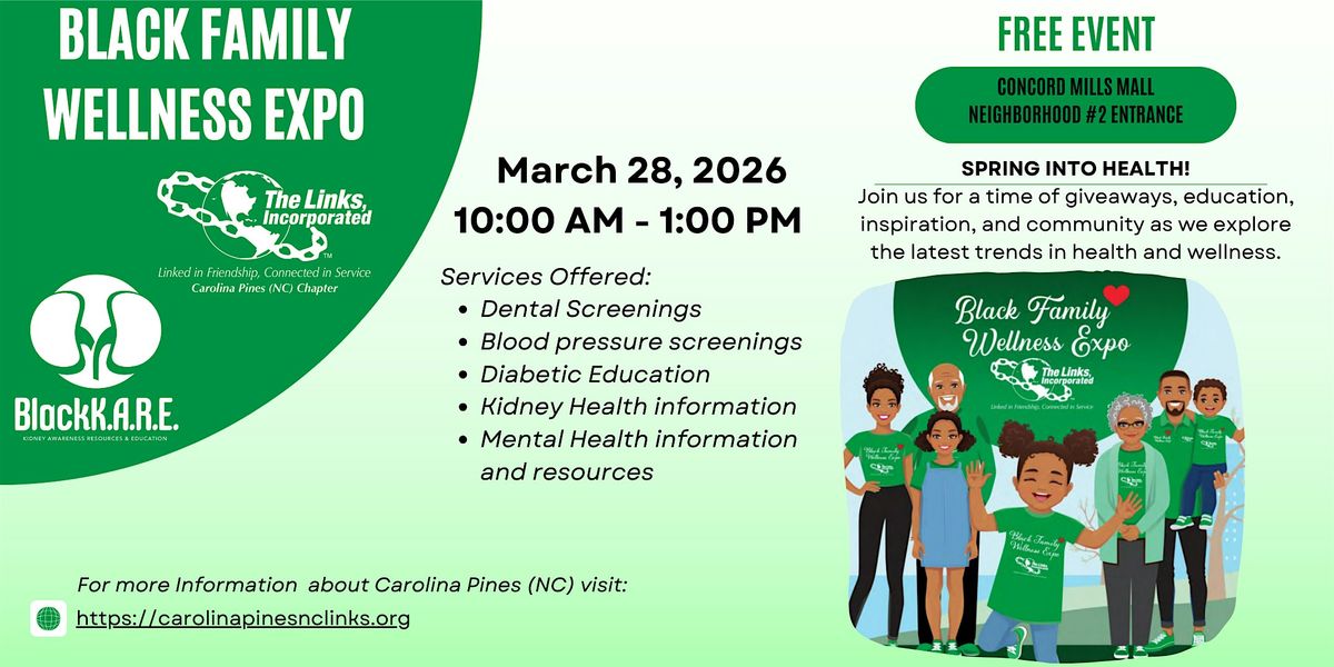 Come join us for the Black Family Wellness Expo at Concord Mills Mall for this exciting in-person event. Get ready to explore various aspects of wellness, including physical, mental, and emotional health.