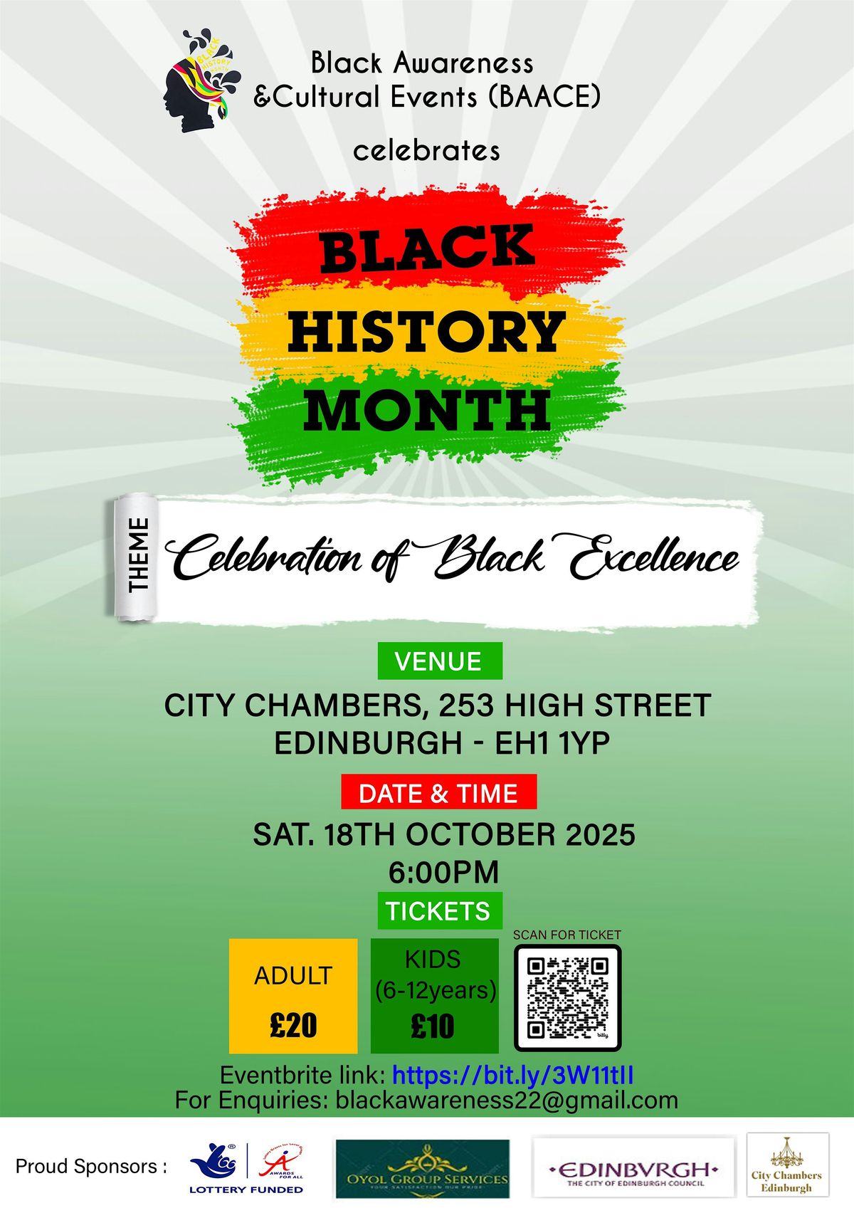 Celebrate the rich history and culture of the Black community at our in-person event located at Edinburgh City Chambers - 253 High Street. Join us for a day filled with educational exhibits, inspiring performances, and thought-provoking discussions. This event is a wonderful opportunity to honor the achievements and contributions of Black individuals throughout history. Don't miss out on this special occasion to come together and learn more about Black history. See you there!