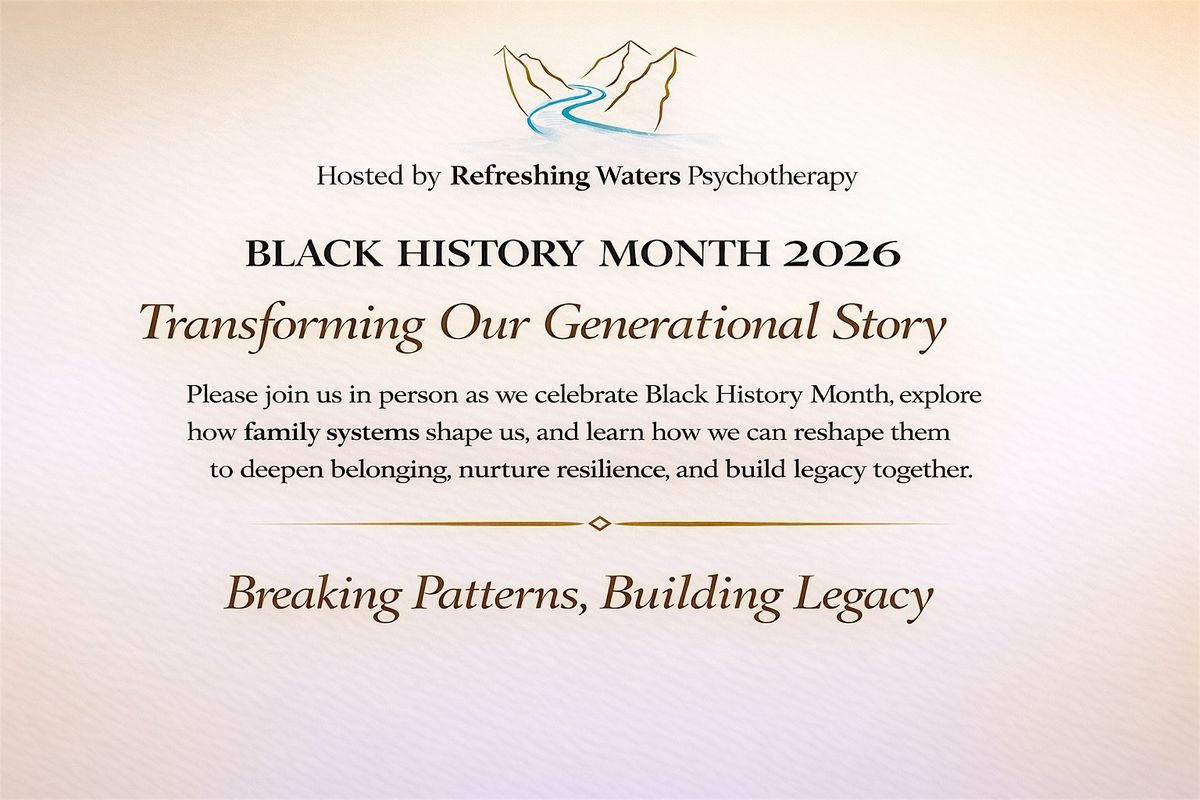 In honour of Black History Month, Refreshing Waters Psychotherapy invites you to join us for a guided and interactive community conversation exploring family systems, generational patterns, and what it means to disrupt what no longer serves us while strengthening what does.