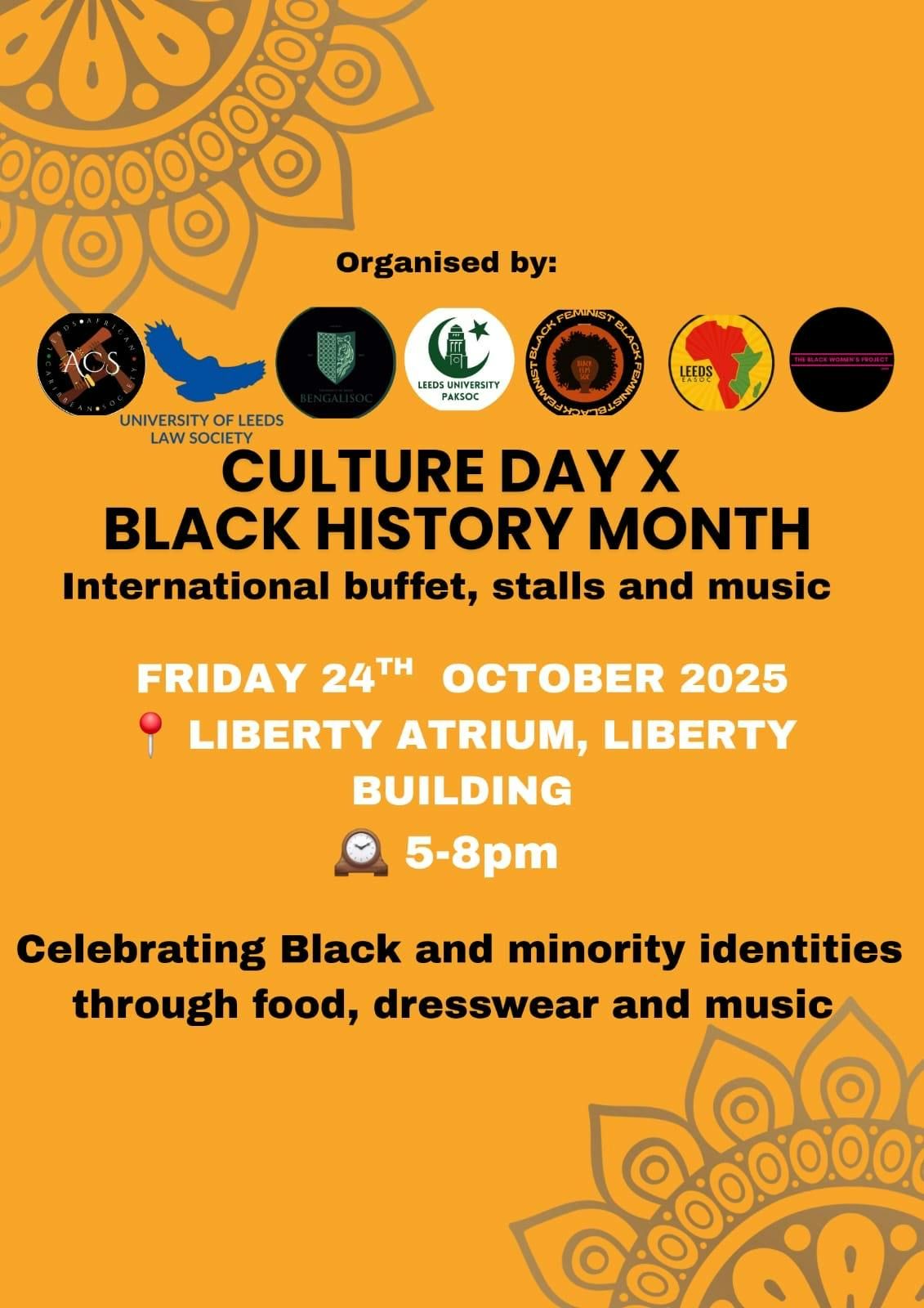 YOU ASKED AND WE DELIVERED!We are pleased to announce our second flagship event in honour of Black History Month, which will be a Culture Day in collaboration with the Law Society, The Black Women's Project Leeds, The Black Feminist Society, Pakistani Society, Bengali Society, and East African Society! For only £5, be prepared to enjoy a day full of food, culture, fashion shows, talks and cultural activities that represent diversity and unity.