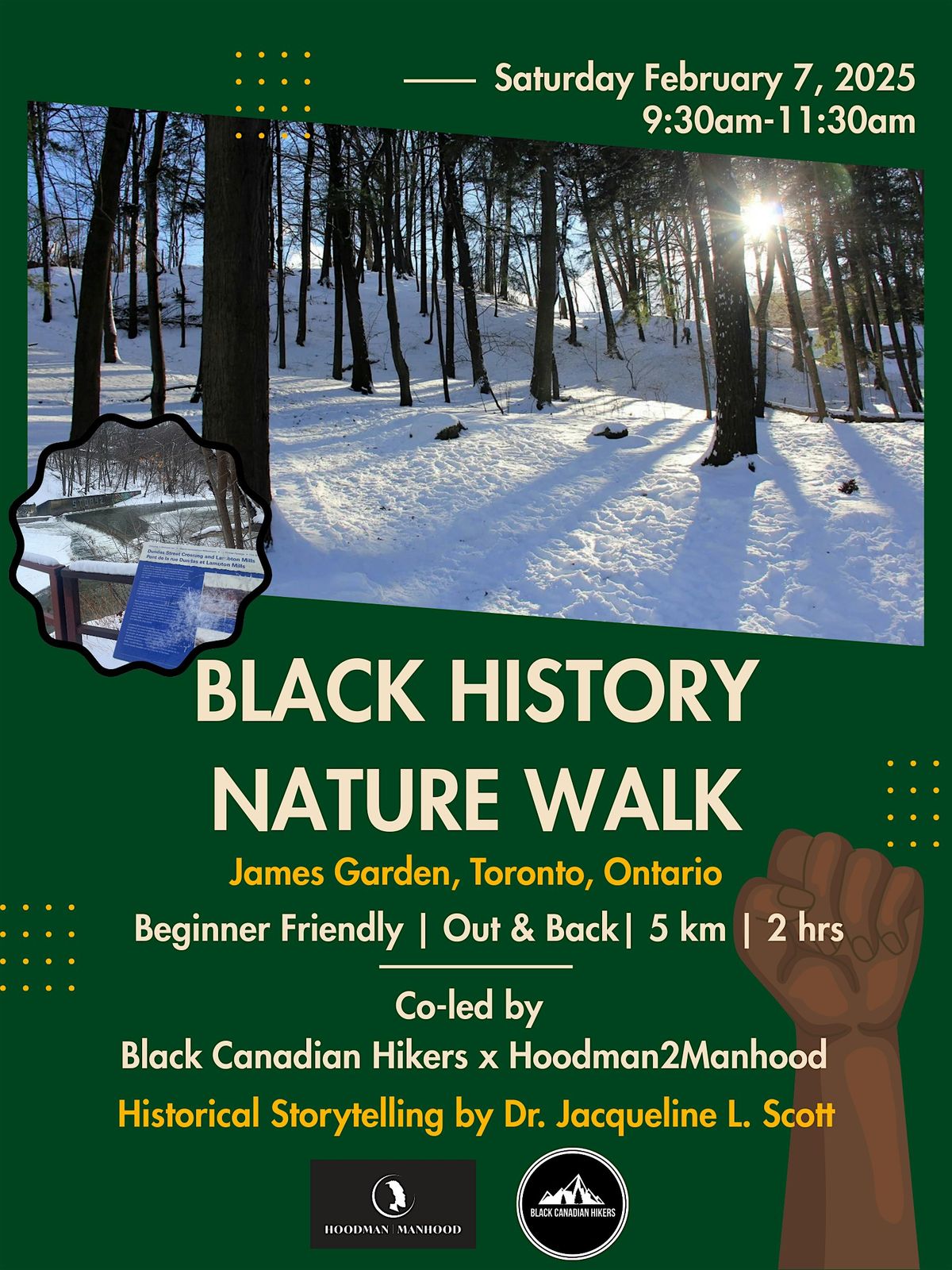 Our hike leaders Shyrai and Tramar will guide participants through the scenic Humber River Valley, beginning at James Gardens in Toronto’s west end and continuing toward Étienne Brûlé Park. Along the way, guest storyteller, Dr. Jacqueline L. Scott will offer a powerful, in-depth account of John Hall’s life.