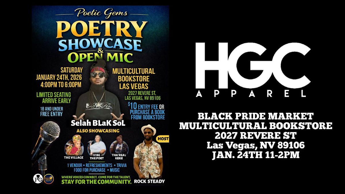 Welcome to the BLACK PRIDE Poetry & Open Mic Showcase happening at Multicultural Bookstore Las Vegas on January 24, 2026 at 4:00 PM (Pacific Time)! Join us for an evening filled with powerful spoken word performances celebrating black pride and culture. Whether you're a seasoned poet or just love to listen, this event is for you. Come share your voice, connect with the community, and be inspired by the talent on display. Don't miss out on this opportunity to be part of something special. See you there!