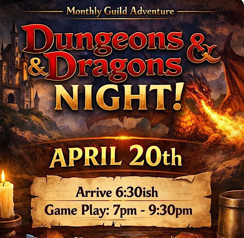 Arrive around 6:30 to settle in, grab a drink, and meet your fellow adventurers. Gameplay begins at 7PM and runs through 9:30PM across multiple tables led by our Dungeon Masters.